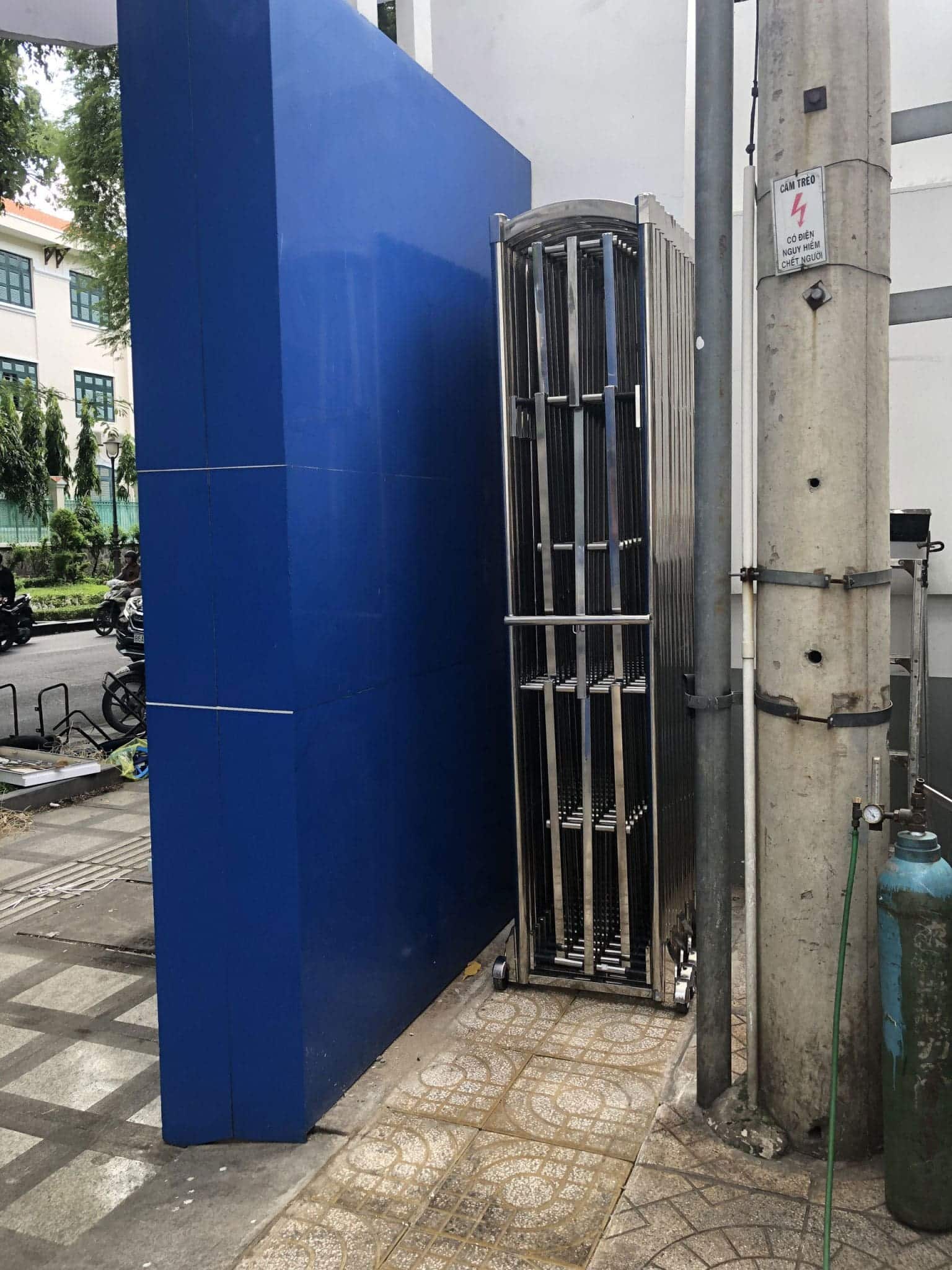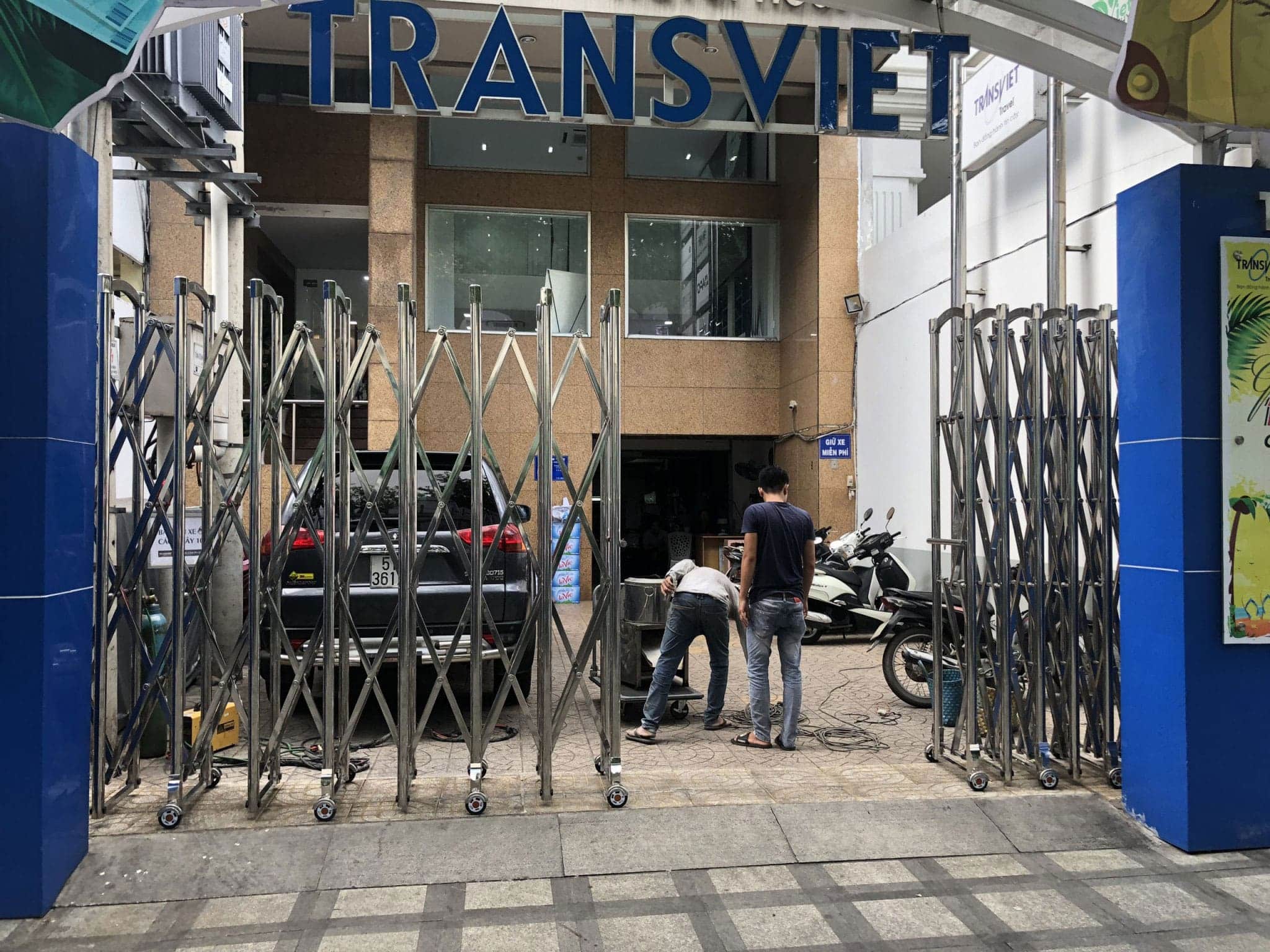 Cổng công ty du lịch Transviet là loại cổng xếp inox kéo tay có chi tiết như sau